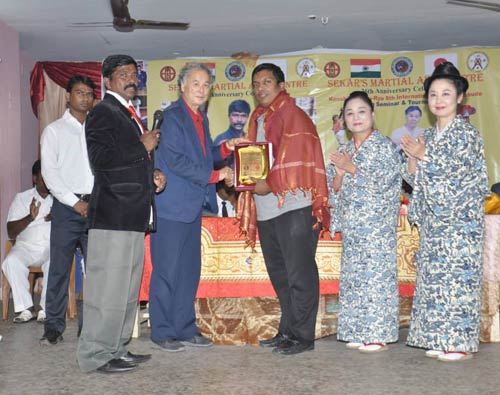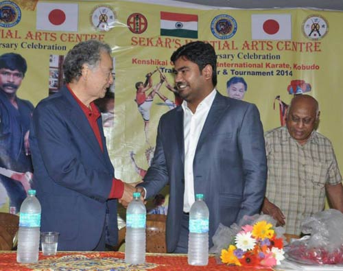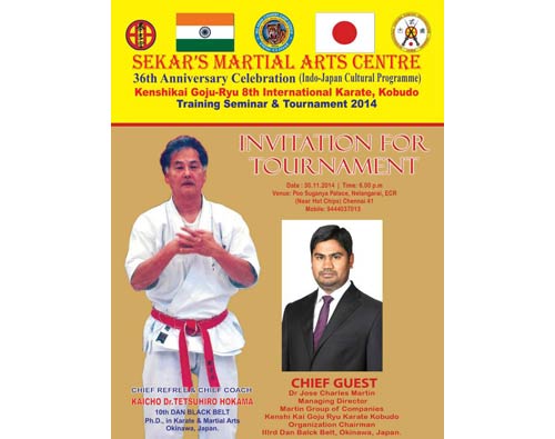 Our MD Mr. Jose Charles Martin -Kenshi Kai Goju Ryu Karate Kobudo, Organization Chairman, 3rd Dan Black Belt, Okinawa, Japan was the chief guest for the 36th Celebration of Sekar's Martial Arts Center on 30th November 2014 at Nelangarai - Chennai. It was a grand celebration with a dance and other entertainment programs. Kenshi Kai Goju Ryu International Karate, Kobudu Tournament 2014 a part of the Indo - Japan Cultural Pregame was also inaugurated .