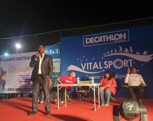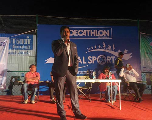 Mr. Jose Charles Martin- The chief guest at the Decathlon Sports Festival giving the opening speech - On the importance and benefits of sports in our lives and he also appreciated Decathlon for organizing such an event for the first time in Coimbatore which has successfully pulled a huge crowd for the event and has inspired many children and adults too.